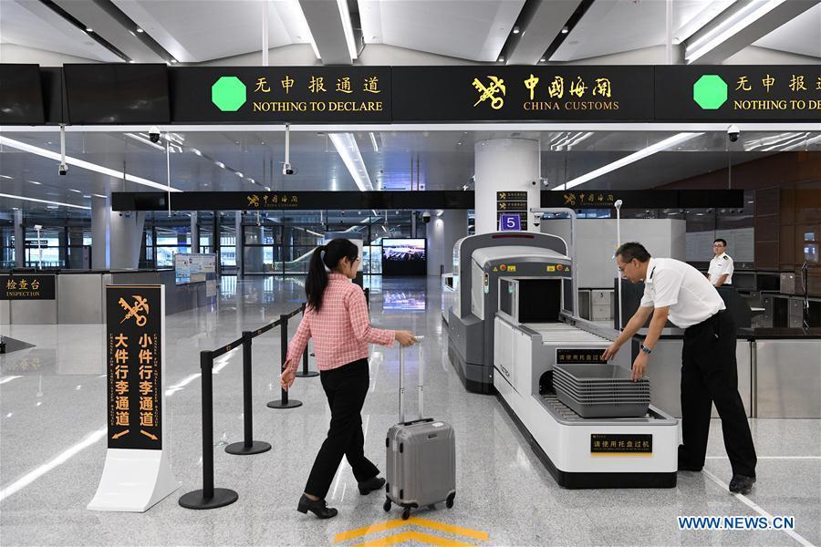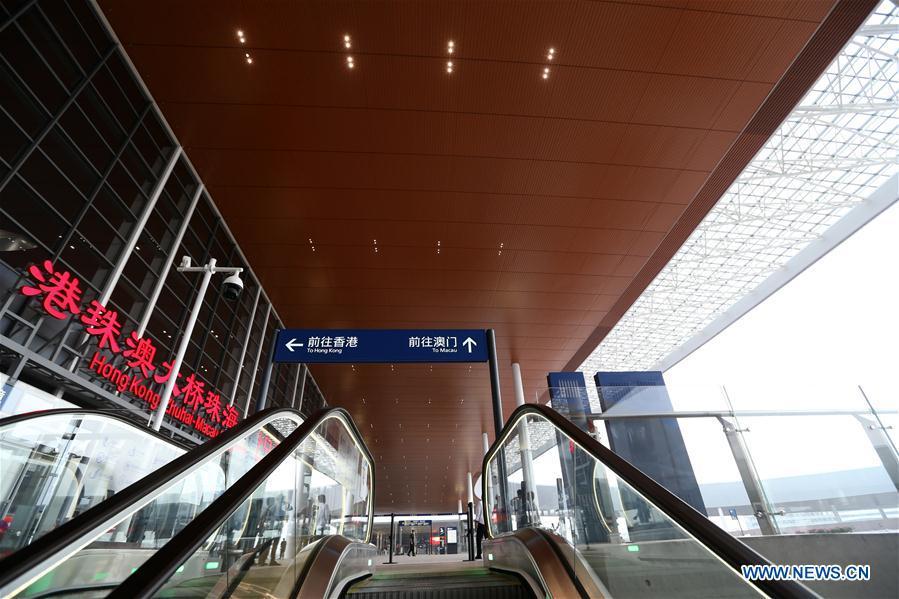 Photo shows the Zhuhai Port of Hong Kong-Zhuhai-Macao Bridge in Zhuhai, south China's Guangdong Province, Oct. 19, 2018. Customs clearance between Macao and Zhuhai will be carried out on a "Joint Inspection and One-time Release" principle, in order to make the process efficient for travellers using the Hong Kong-Zhuhai-Macao Bridge. Under the new customs system, travellers will be required to pass border controls only once -- via either the automatic, semi-automatic, or manned channels depending on the identification documents -- to complete the departure and arrival formalities. The bridge will start operation on Oct. 24, further integrating cities in the Pearl River Delta. (Xinhua/Zhang Jiayang)