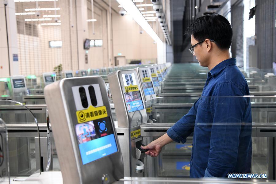 A staff worker demonstrates passing through the automatic channel in Zhuhai Port of Hong Kong-Zhuhai-Macao Bridge in Zhuhai, south China's Guangdong Province, Oct. 18, 2018. Customs clearance between Macao and Zhuhai will be carried out on a "Joint Inspection and One-time Release" principle, in order to make the process efficient for travellers using the Hong Kong-Zhuhai-Macao Bridge. Under the new customs system, travellers will be required to pass border controls only once -- via either the automatic, semi-automatic, or manned channels depending on the identification documents -- to complete the departure and arrival formalities. The bridge will start operation on Oct. 24, further integrating cities in the Pearl River Delta. (Xinhua/Liang Xu)