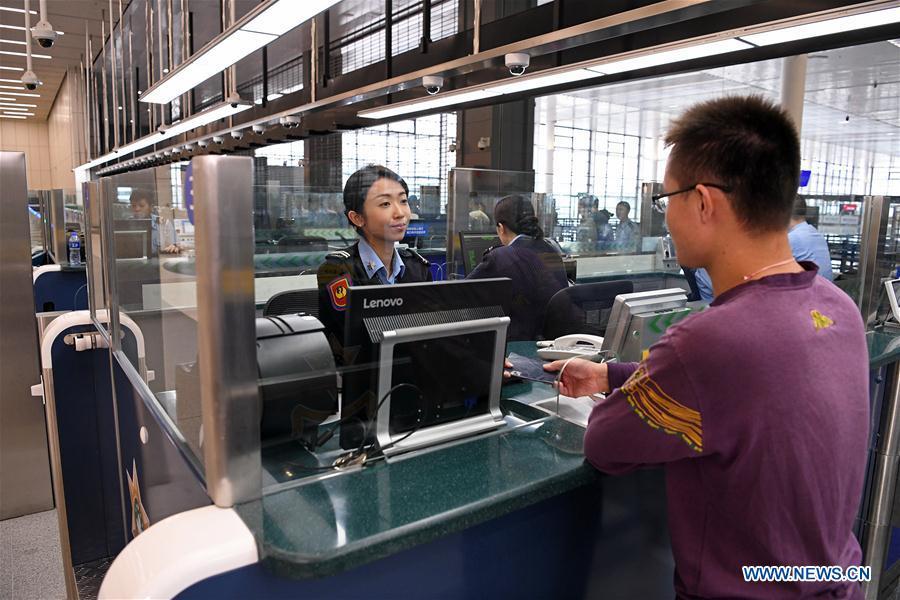A staff worker demonstrates passing through an automatic channel in Zhuhai Port of Hong Kong-Zhuhai-Macao Bridge in Zhuhai, south China's Guangdong Province, Oct. 18, 2018. Customs clearance between Macao and Zhuhai will be carried out on a "Joint Inspection and One-time Release" principle, in order to make the process efficient for travellers using the Hong Kong-Zhuhai-Macao Bridge. Under the new customs system, travellers will be required to pass border controls only once -- via either the automatic, semi-automatic, or manned channels depending on the identification documents -- to complete the departure and arrival formalities. The bridge will start operation on Oct. 24, further integrating cities in the Pearl River Delta. (Xinhua/Liang Xu)