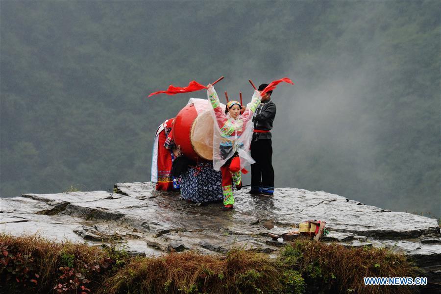 Performers stage a drum dance of the Miao ethnic group at the Dehang scenic area in Jishou in the Tujia and Miao Autonomous Prefecture of Xiangxi, central China's Hunan Province, Oct. 20, 2018. (Xinhua/Yao Fang)