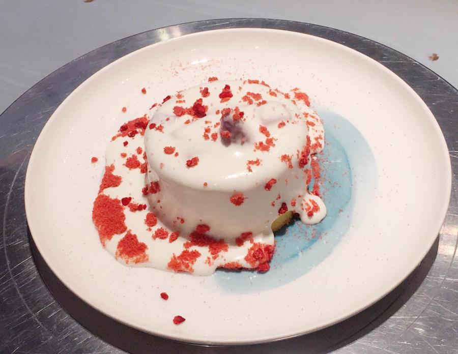 Another dessert that is as tasty as it is visually stimulating is the mousse cake in the shape of a steamed bun. Once the waiter pours water onto the dish, because of the dry ice underneath, the dessert is surrounded by rising smoke just like a magic show.
