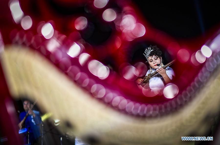 Local arists perform traditional instruments during a desert-themed concert held in Qiemo County in the Mongolian Autonomous Prefecture of Bayingolin, northwest China's Xinjiang Uygur Autonomous Region, Oct. 20, 2018. (Xinhua/Zhao Ge)