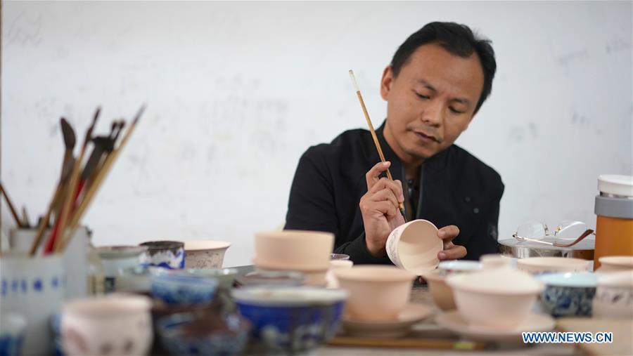 A craftsman named Liu Zhen paints on the body of an eggshell porcelain in Jingdezhen, east China's Jiangxi Province, on Oct. 19, 2018. Eggshell porcelain, one of the traditional porcelains produced in "China's porcelain capital" Jingdezhen, features a papery and translucent porcelain body. With tens of complicated purely hand-made producing steps, every single eggshell porcelain needs at least two months consumed.(Xinhua/Hu Chenhuan)