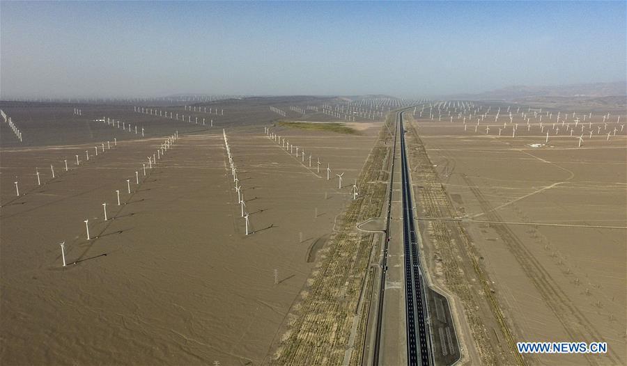 A bullet train runs past a wind power plant in Urumqi, northwest China's Xinjiang Uygur Autonomous Region, May 29, 2014. Xinjiang has seen a surge in the electricity generation from clean energy. According to State Grid Xinjiang Electric Power Co., Ltd., wind and solar power generated 27.81 billion and 9.07 billion kilowatt hours (kwh) of electricity, respectively, in the first nine months of 2018 in the region. With abundant wind and solar resources, Xinjiang is a pioneer in using new energy in China, with installed new-energy capacity having exceeded 27 million kilowatts so far. (Xinhua/Zhao Ge)