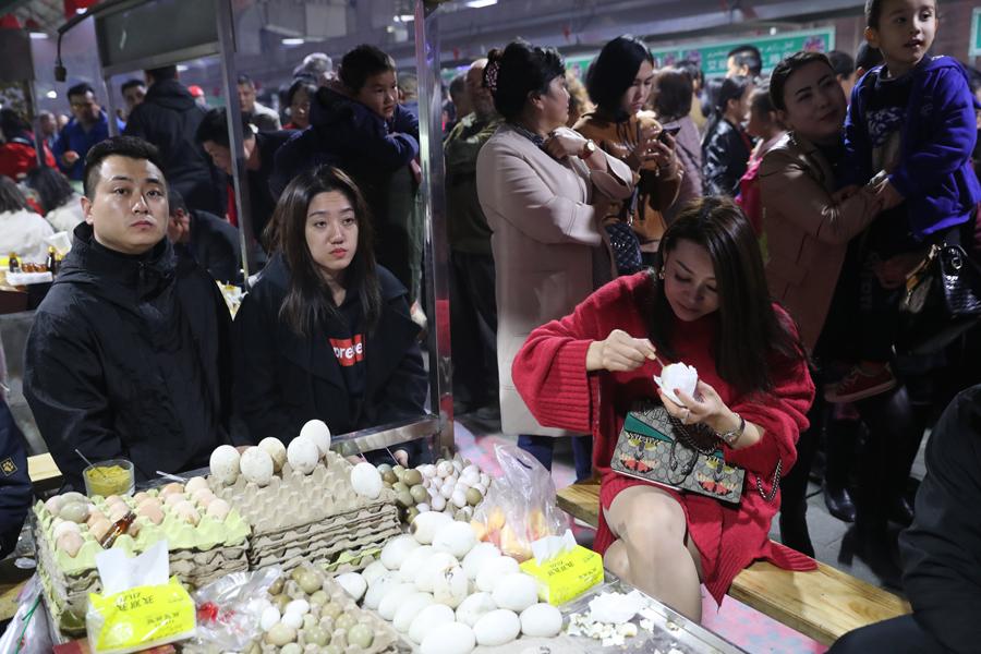 The Hotan night food market is packed with people in Northwest China's Xinjiang Uygur autonomous region, Oct. 22, 2018. (Photo/chinadaily.com.cn)