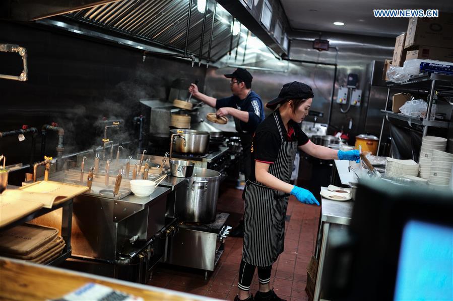 Staffs prepare food in Shaxian Snacks restaurant in Brooklyn, New York, the United States, on Oct. 21, 2018. China's restaurant chain serving Shaxian County cuisine has opened its first eatery in the United States. Located at 818, 60th St. Brooklyn, the restaurant, which opened Monday, presents overseas foodies with traditional Chinese snacks, including peanut butter noodles and pork wontons. (Xinhua/Li Muzi)