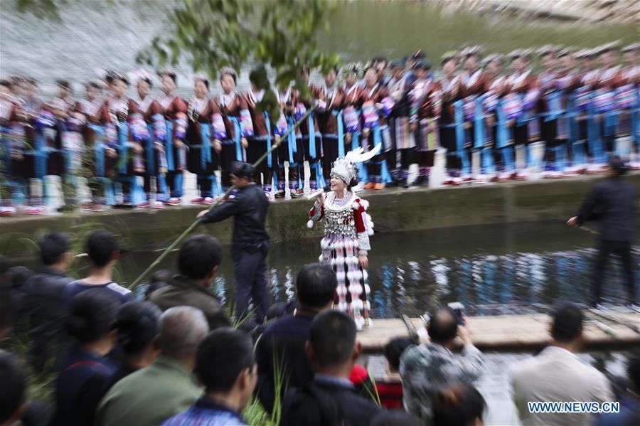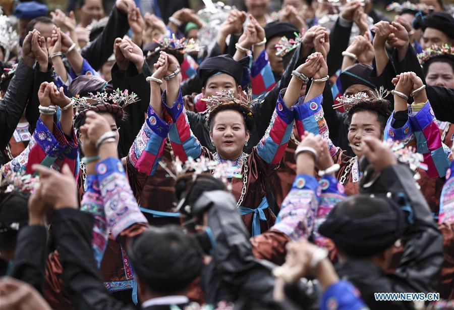 People sing and dance during a harvest festival in Dongtou Village, Rongshui Miao Autonomous County, south China's Guangxi Zhuang Autonomous Region, Oct. 26, 2018. Local people celebrated harvest Friday through various activities like fish feast, singing and playing lusheng. (Xinhua/Huang Xiaobang)