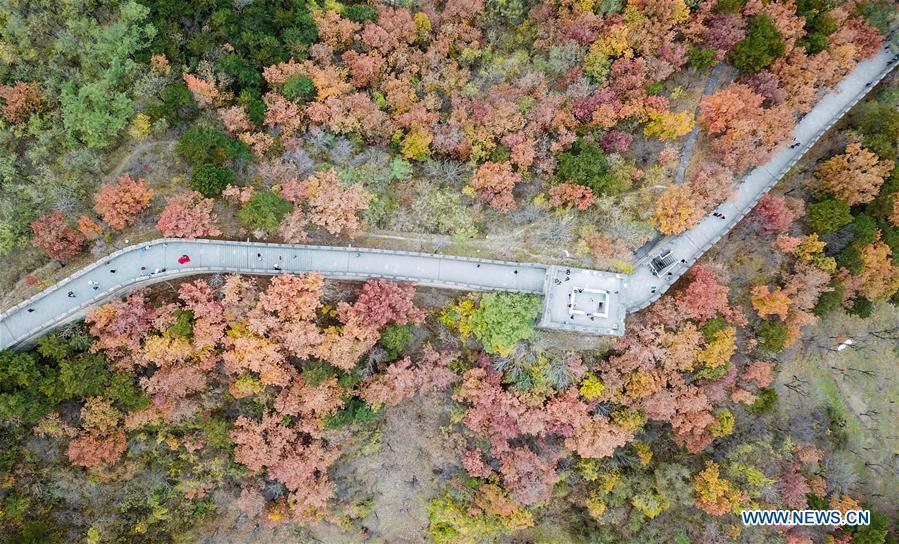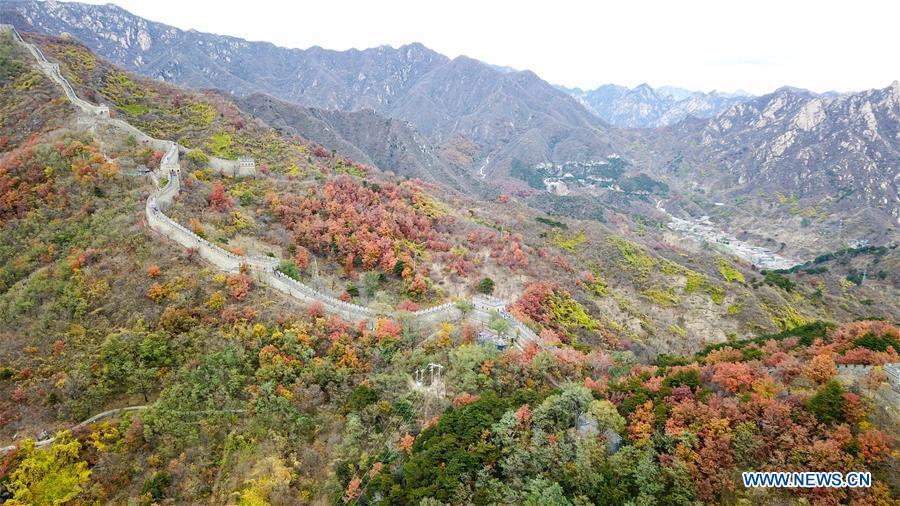 Aerial photo taken on Oct. 28, 2018 shows the autumn scenery of the Mutianyu Great Wall in Beijing, capital of China. (Xinhua/Chen Yehua)
