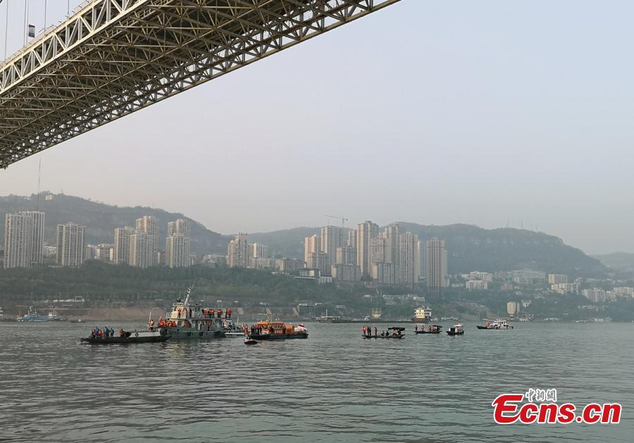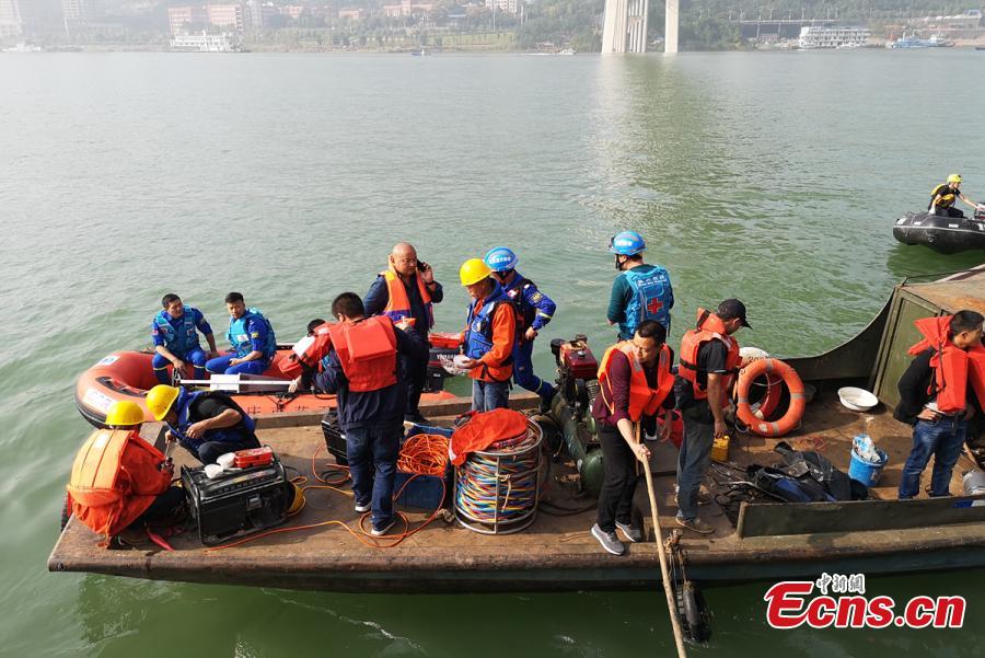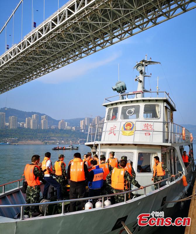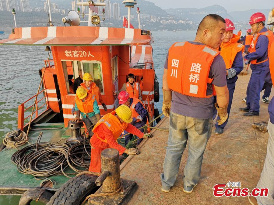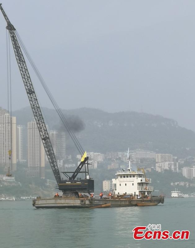 A floating crane, capable of hoisting 60 tons, arrives at the site of a bus accident in Wanzhou District, Southwest China's Chongqing Municipality, Oct. 28, 2018. Two bodies have been retrieved from the river after a bus with a dozen passengers on board veered onto the wrong side of the road, colliding with a private car before plunging into the Yangtze River. Sichuan Road and Bridge has dispatched a large floating crane and experienced rescuers to assist in the search for survivors. (Photo provided to China News Service)