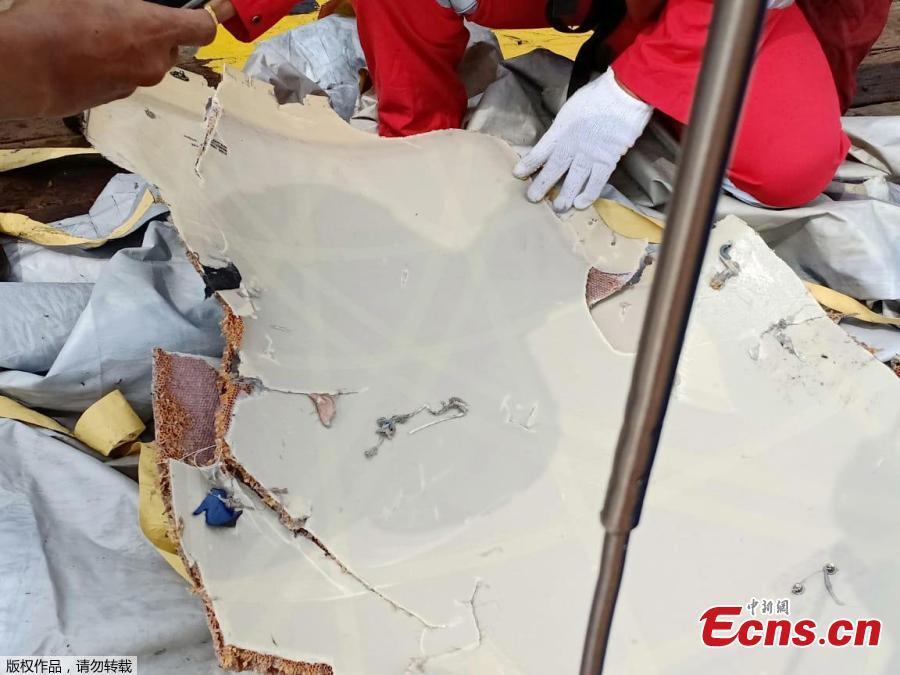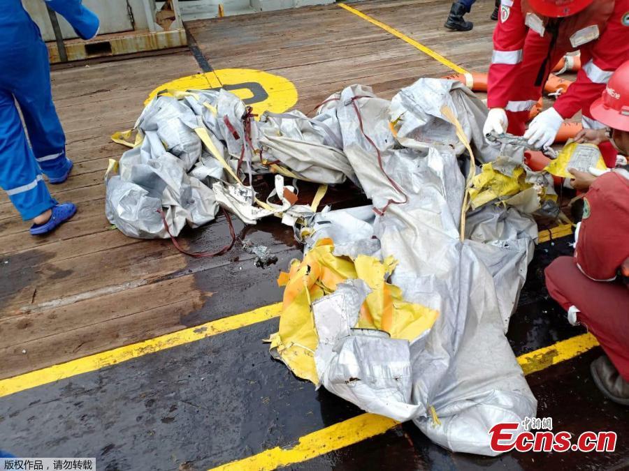 Workers of PT Pertamina examine recovered debris of what is believed from the crashed Lion Air flight JT610, onboard Prabu ship owned by PT Pertamina, off the shore of Karawang regency, West Java province, Indonesia, Oct. 29, 2018. An aircraft with 188 people on board is believed to have sunk after crashing into the sea off Indonesia’s island of Java on Monday, shortly after takeoff from the capital on its way to the country’s tin-mining hub, officials said. (Photo/Agencies)