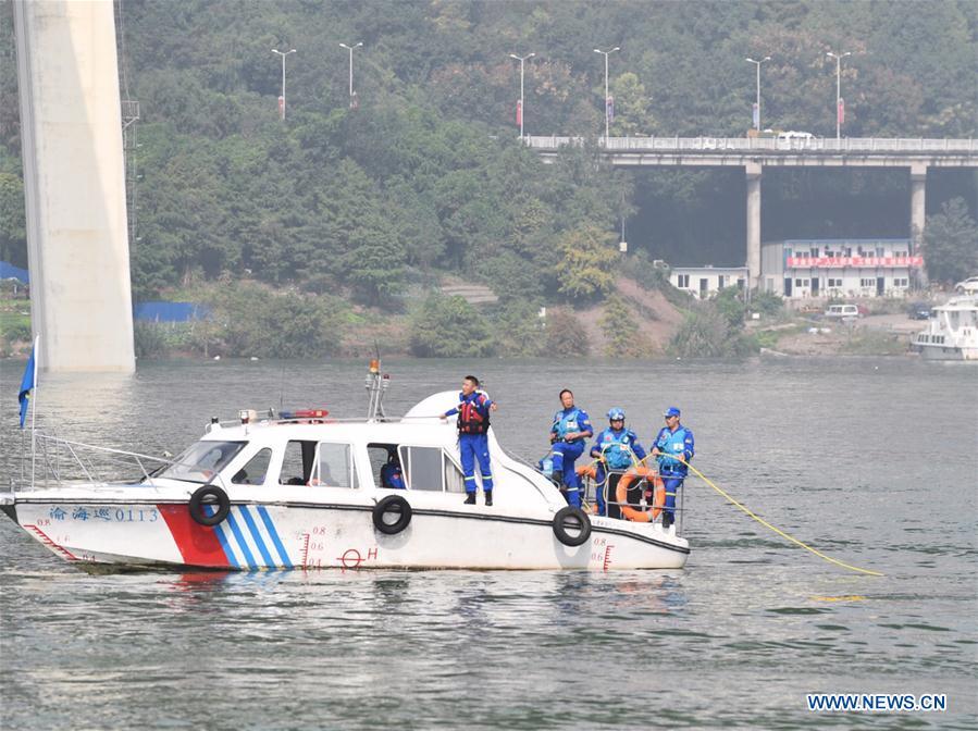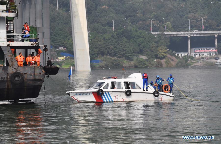 Photo taken on Oct. 29, 2018 shows rescuers working at the accident site in Wanzhou District, southwest China's Chongqing. Fifteen people were confirmed to have been on a bus that plunged into the Yangtze River in Chongqing on Sunday, local authorities said Monday. Two bodies have been retrieved from the river so far, but their identities are not yet known. The bus veered onto the wrong side of the road and collided into an oncoming private car before breaking through road fencing and flying off a bridge in Wanzhou District at 10:08 a.m. Sunday. Rescue work is still ongoing. With the help of a sonar system, professional rescue ships located an 11-meter-long and three-meter-wide object on the river bottom and it was believed that it is the sunken bus.(Xinhua/Wang Quanchao)