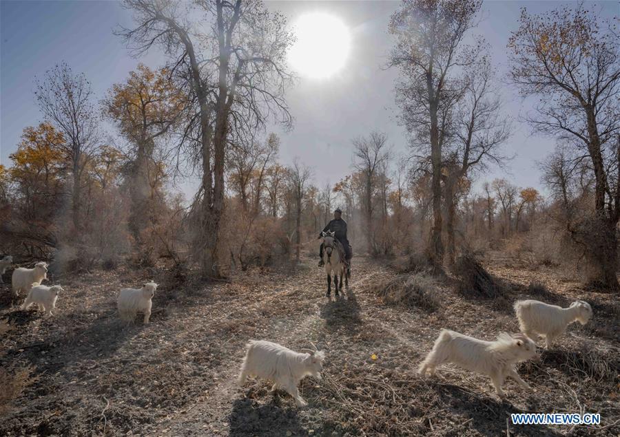 A herdsman grazes sheep in a forest of desert poplar in Yuli County, northwest China's Xinjiang Uygur Autonomous Region, Oct. 25, 2018. Xinjiang has infused 7 billion cubic meters of water to the dry trunk stream of the lower reaches of the Tarim River in 18 rounds of water diversion since 2000, making the local forest of desert poplar a tourist attraction.(Xinhua/Zhao Ge)