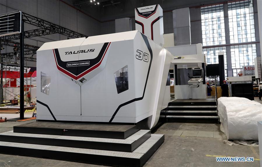 A Taurus milling machine from German Waldrich Coburg is adjusted at an exhibition hall in the National Exhibition and Convention Center (Shanghai) in Shanghai, east China, on Oct. 30, 2018. The final work is underway to get all eight exhibition halls ready for the first China International Import Expo (CIIE), scheduled to be held from Nov. 5 to 10. (Xinhua/Fang Zhe)