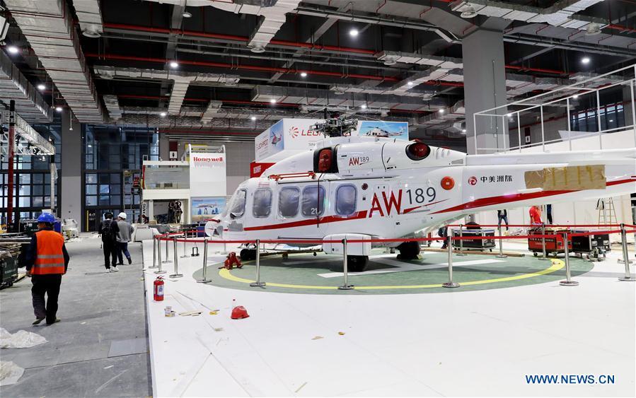 An AW189 helicopter from Italian Leonardo S.p.A. is seen at an exhibition hall in the National Exhibition and Convention Center (Shanghai) in Shanghai, east China, on Oct. 30, 2018. The final work is underway to get all eight exhibition halls ready for the first China International Import Expo (CIIE), scheduled to be held from Nov. 5 to 10. (Xinhua/Fang Zhe)