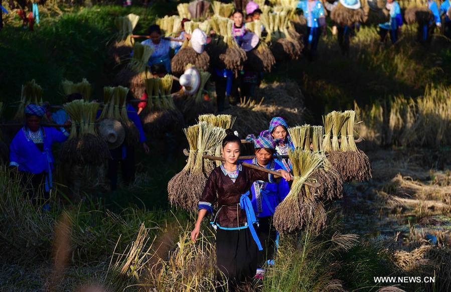 Farmers of the Miao ethnic group carry bales of purple glutinous rice at Yuanbao Village in Antai Township in Rongshui Miao Autonomous County, south China's Guangxi Zhuang Autonomous Region, Oct. 30, 2018. Farmers are busy harvesting purple glutinous rice in Antai, where a production mode that incorporates cooperatives, planting bases and individual farmers has helped the locals out of poverty. (Xinhua/Huang Xiaobang)