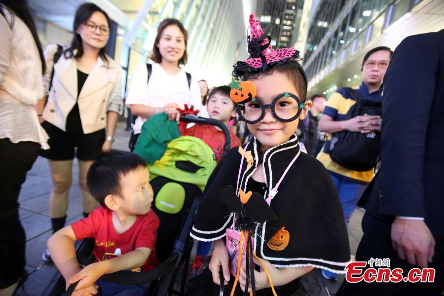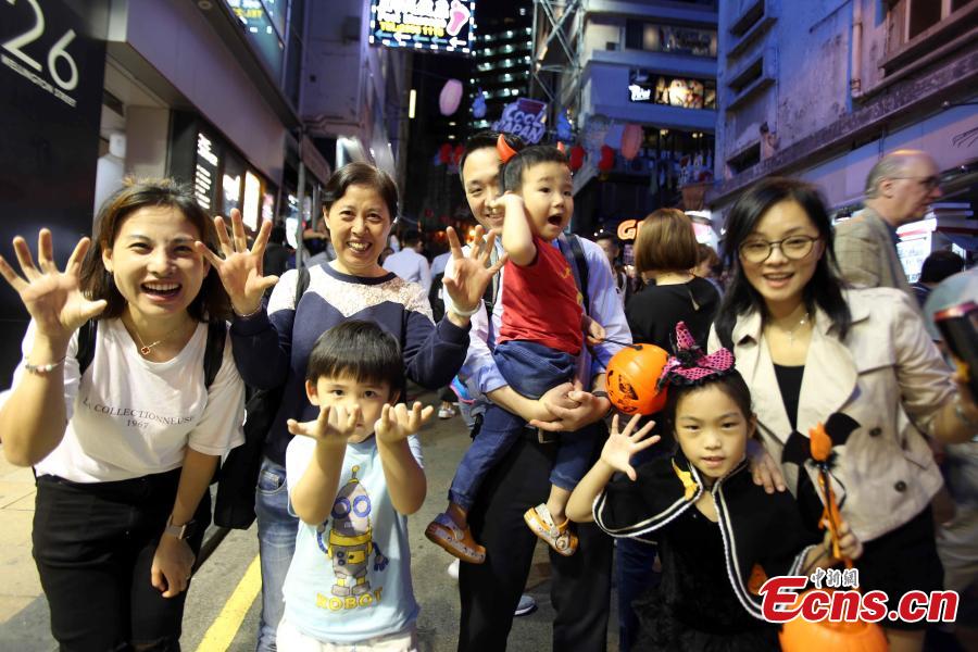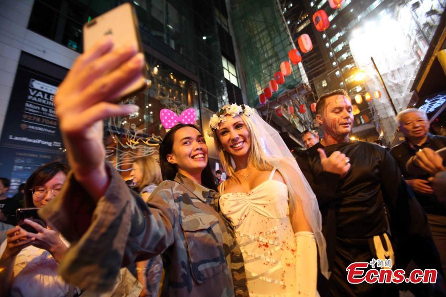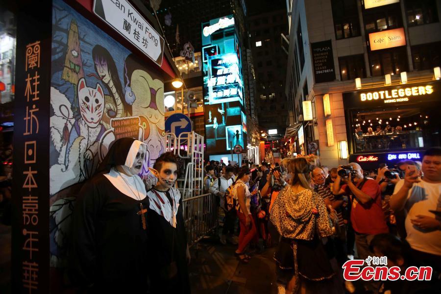 People dressed in Halloween costumes celebrate the western festival at Lan Kwai Fong in Hong Kong on October 31, 2018. (Photo: China News Service/Hong Shaokui)