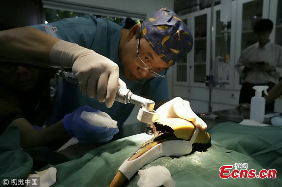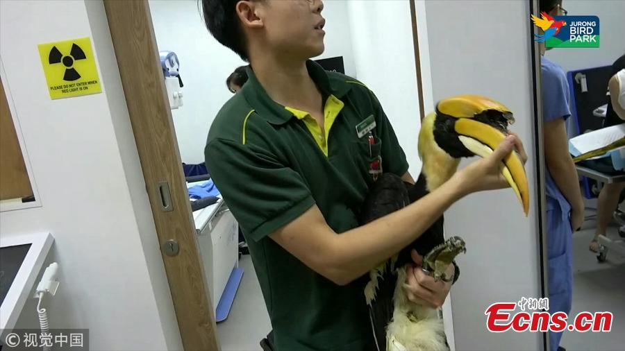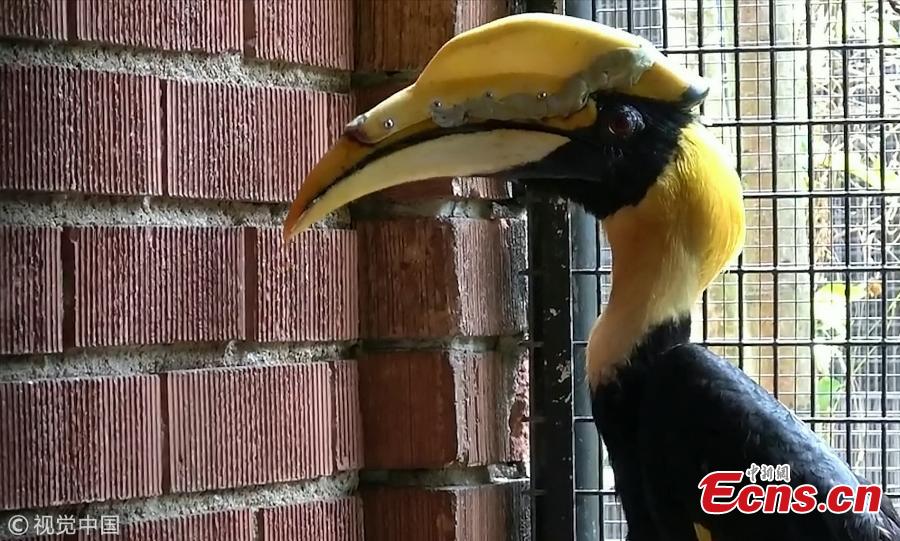 Jary, 22-year-old male great pied hornbill, has been given a 3D-printed prosthetic casque after surgery to remove cancerous tissue.In July, staff at Jurong Bird Park discovered an 8cm gash on Jary's casque - an enlarged section on the bill. They suspected the bird might be suffering from cancer as much of the tissue under Jary's casque had been destroyed by the disease. After a CT scan, surgeons decided to remove all the cancerous growth. The team worked with National University of Singapore to create a model of the casque for Jary to cover the exposed tissue as well as a jig to guide the saw during surgery. The whole design and 3D printing process took almost two months to complete.(Photo/VCG)