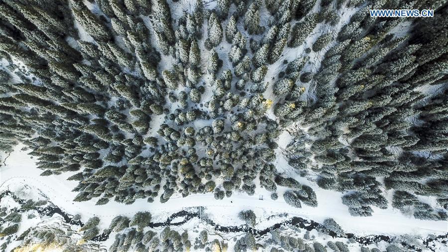 Aerial photo taken on Nov. 4, 2018 shows snow scenery in Nanshan scenic spot in southern Urumqi, capital of northwest China's Xinjiang Uygur Autonomous Region. (Xinhua/Hu Huhu)