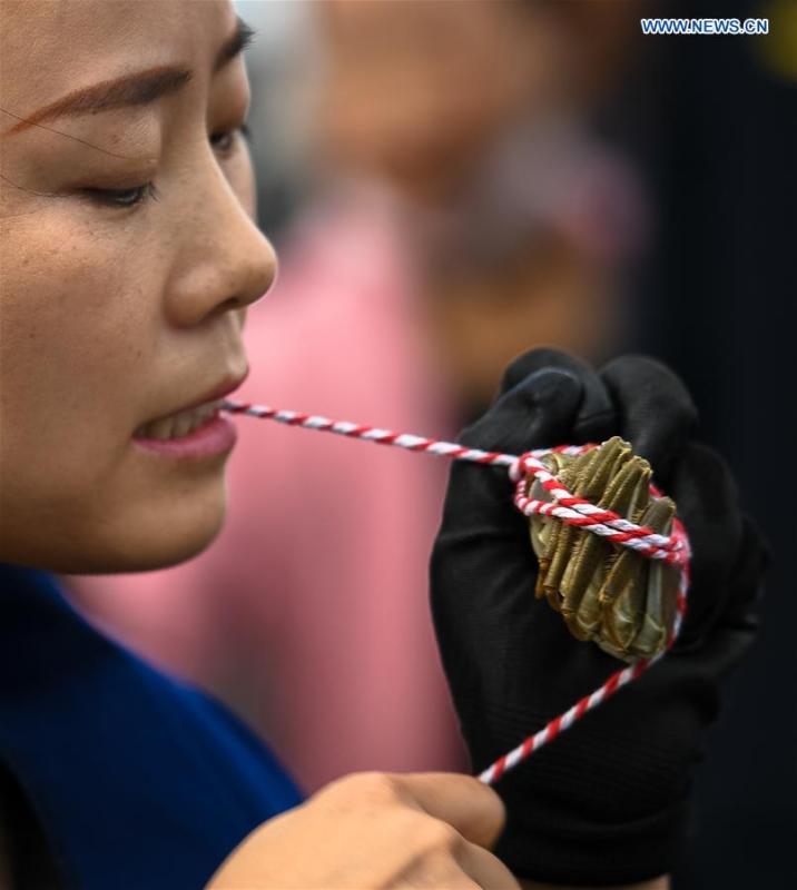 A woman takes part in a crab binding contest in Sihong County, east China's Jiangsu Province, Nov. 3, 2018. A total of 100 contestants participated in the event on Saturday. The winner bound 30 crabs within 3 minutes and 59 seconds. (Xinhua/Li Xiang)