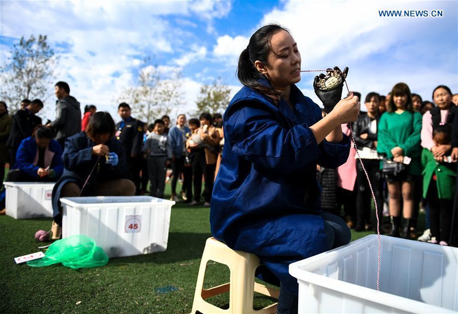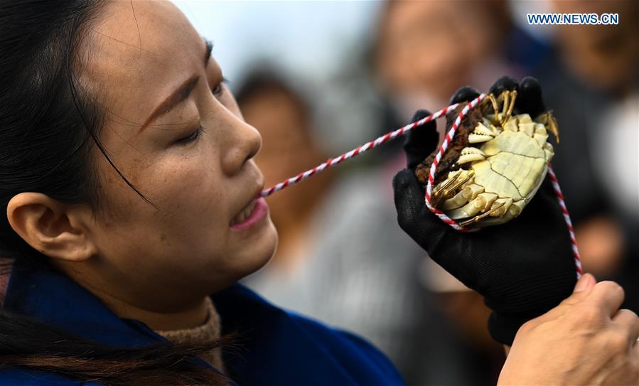 People take part in a crab binding contest in Sihong County, east China's Jiangsu Province, Nov. 3, 2018. A total of 100 contestants participated in the event on Saturday. The winner bound 30 crabs within 3 minutes and 59 seconds. (Xinhua/Li Xiang)