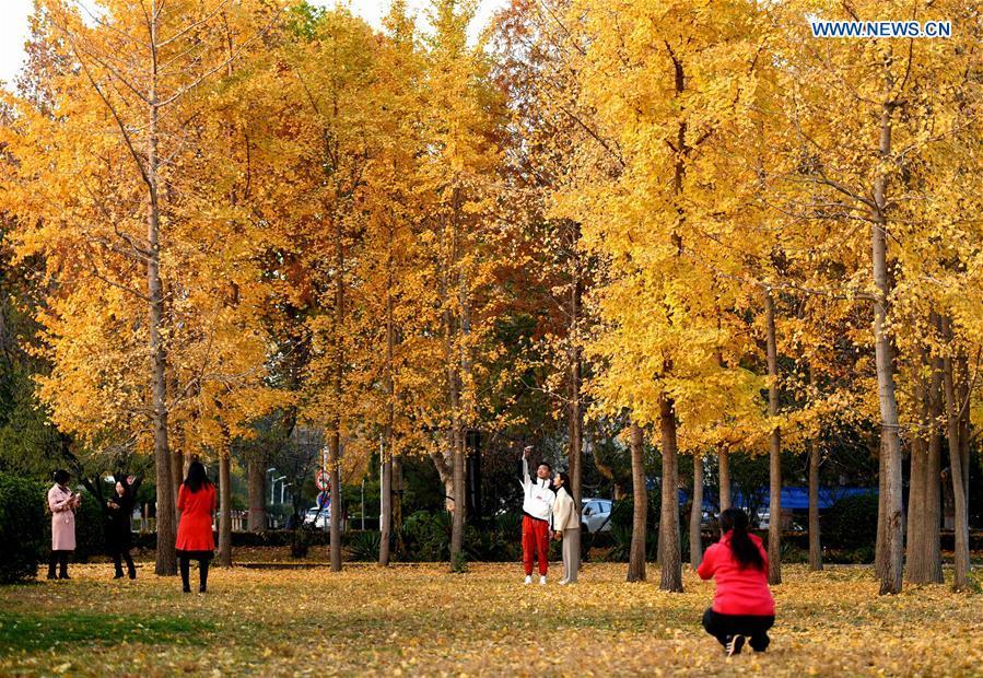 People spend their leisure time under ginkgo trees at Hebei University of Economics and Business in Shijiazhuang, north China's Hebei Province, Nov. 9, 2018. (Xinhua/Chen Qibao)
