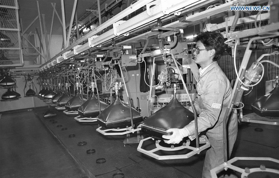 A man works at a factory of Panasonic color television picture tube company jointly run by China and Japan, in this file photo taken in February 1990 in Beijing, capital of China. (Xinhua/Yu Huiru)