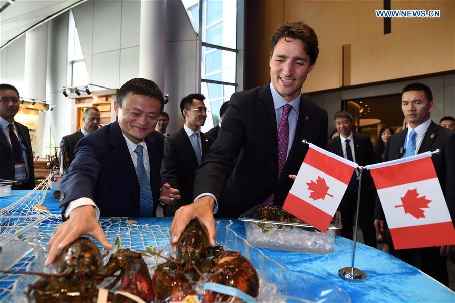 File photo taken on Sept. 3, 2016 shows Canadian Prime Minister Justin Trudeau and Alibaba Chairman Jack Ma grabbing lobsters imported from Canada at the headquarters of Alibaba in Hangzhou, capital of east China's Zhejiang Province. (Xinhua/Jin Liangkuai)