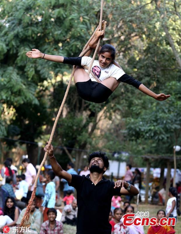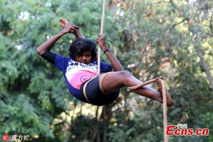 An Indian School child performs rope yoga ahead of children's day festival at a park, in Bangalore, India, 10 November 2018. Children's day, in India is celebrated every year on 14 November to increase the awareness of people towards the rights, care, and education of children. (Photo/IC)
