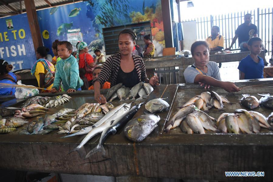 Photo taken on Nov. 11, 2018 shows a fish market in Port Moresby, Papua New Guinea. Leaders from the Asia-Pacific economies are gathering in Port Moresby, the capital of Papua New Guinea for the Asia-Pacific Economic Cooperation (APEC) Leaders' Week on Nov. 12-18. (Xinhua/Lui Siu Wai)