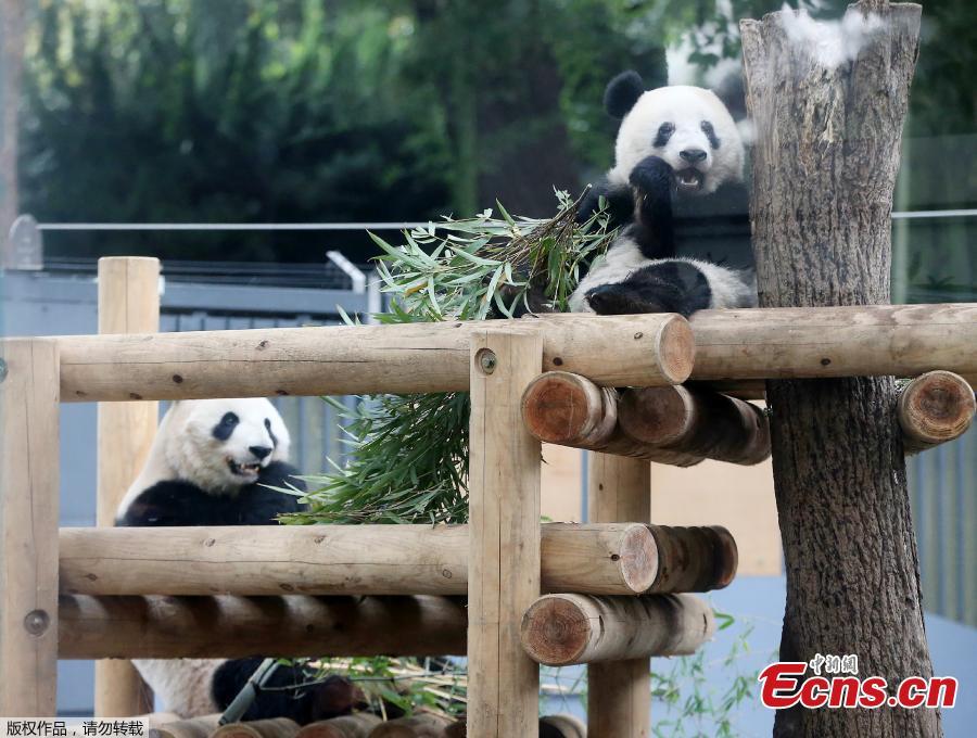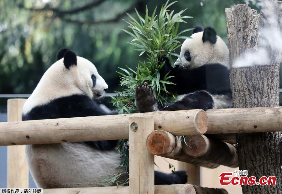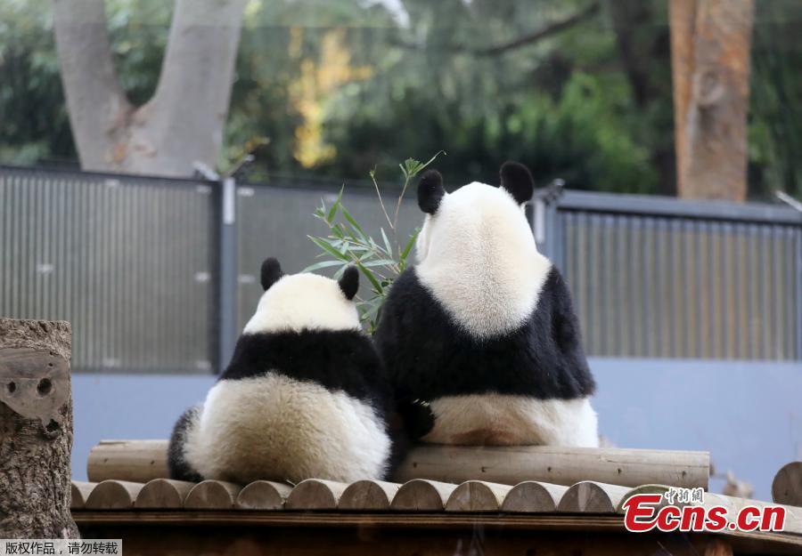 Female giant panda cub Xiang Xiang (R) and her mother Shin Shin (L) eat bamboo at Ueno Zoo in Tokyo on November 12, 2018. (Photo/Agencies)