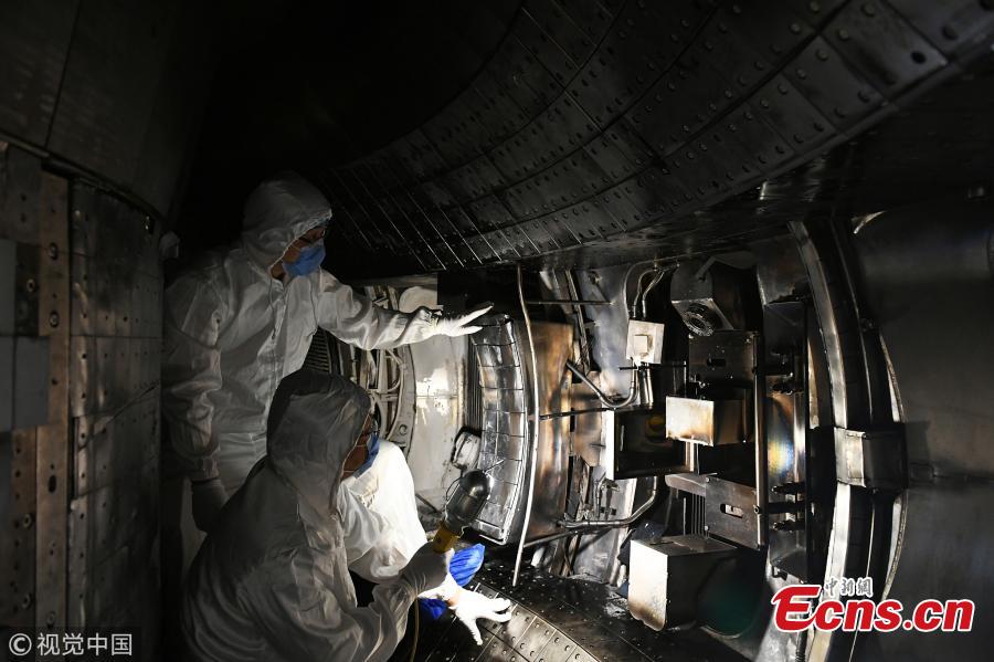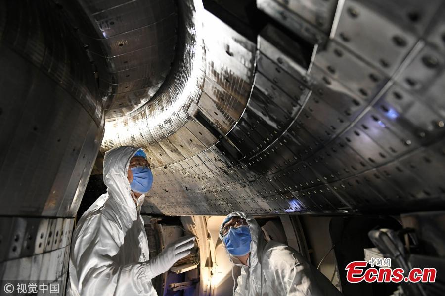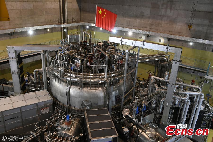 China's self-designed "artificial sun," a device to harness the energy of fusion, has made an important advance by achieving a temperature of 100 million C in plasma and a heating power of 10 megawatts, media reported, noting the progress could pave the way for developing clean energy through nuclear fusion. The Institute of Plasma Physics, affiliated with the Chinese Academy of Sciences, announced on its website on Monday that various data points achieved in the experiments are close to meeting physics' demand for future steady-state fusion reactor operation. Independently designed and developed by China, the Experimental Advanced Superconducting Tokamak (EAST) is the world's first fully superconducting tokamak with non-circular cross-section and the country's fourth generation experimental nuclear fusion device(Photo/VCG)