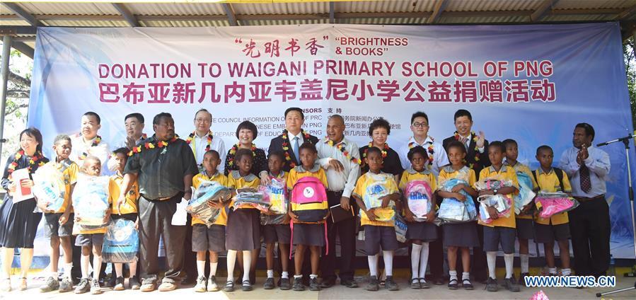 Guo Weimin (C), deputy director of the State Council Information Office of China, attends a donation ceremony to a local primary school in Port Moresby, Papua New Guinea, on Nov. 12, 2018. A series of cultural exchange activities were held here on Monday between China and Papua New Guinea (PNG) ahead of the Asia-Pacific Economic Cooperation (APEC) Leaders' Meeting. (Xinhua/Lui Siu Wai)
