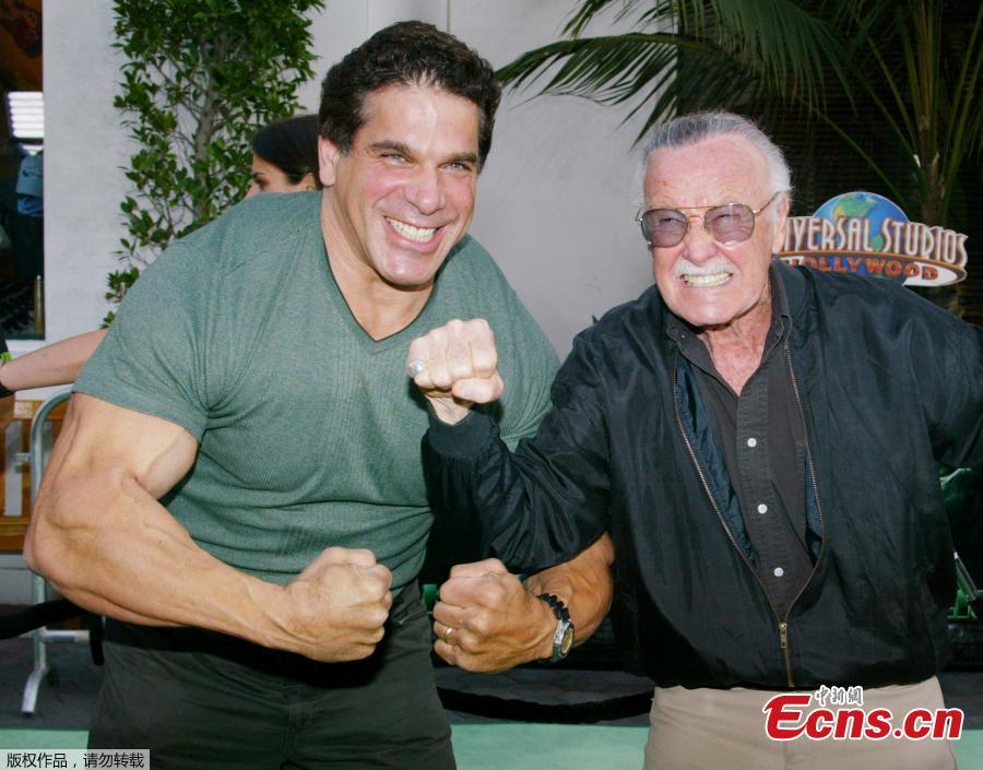 File photo: Stan Lee (R) creator of comic book character "The Hulk" and actor Lou Ferrigno, who portrayed "The Hulk" on television, give their best "Hulk" pose for photographers at the premiere of the new action film "The Hulk" in Los Angeles June 17, 2003. (Photo/Agencies)