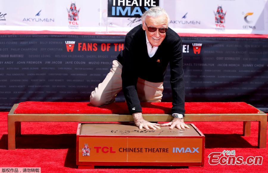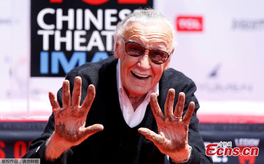 File photo: Marvel Comics co-creator Stan Lee shows his hands after placing them in cement during a ceremony in the forecourt of the TCL Chinese theatre in Los Angeles, California, U.S., July 18, 2017. (Photo/Agencies)