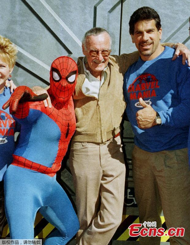 File photo: Marvel Comic Books founder Stan Lee (C) poses with one of his characters "Spider-Man" (L) and actor Lou Ferrigno who portrayed "The Incredible Hulk" on television, during the grand opening of the Marvel Mania restaurant at Universal CityWalk in Los Angeles February 18, 1998.(Photo/Agencies)