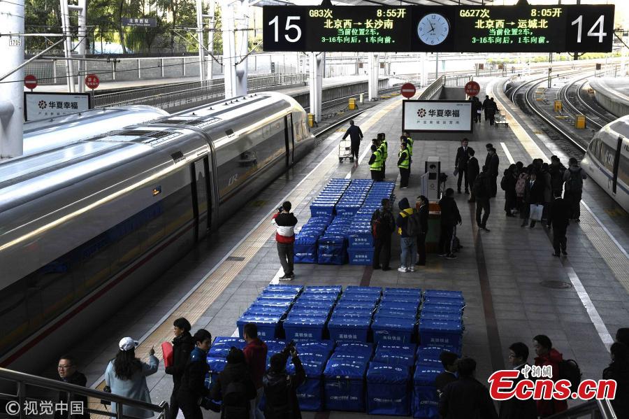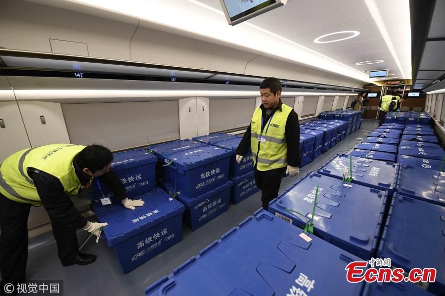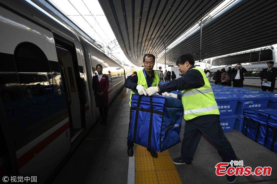 Fuxing bullet trains between Beijing and Changsha, the capital city of Central China's Hunan province, join the battle to deliver for Singles' Day, an annual e-commerce shopping spree in China that falls on last Sunday. It is the first time that two Fuxing bullet trains between Beijing and Changsha deliver goods bought on Singles' Day from Nov 11 to 20, each with a delivery capacity of about 50,000 tonnes. One carriage of each train will carry goods, mainly documents, garments, food, electronic devices, and others. Delivery time will be cut down to about five hours, faster than road transportation which usually takes 20 to 24 hours. (Photo/VCG)