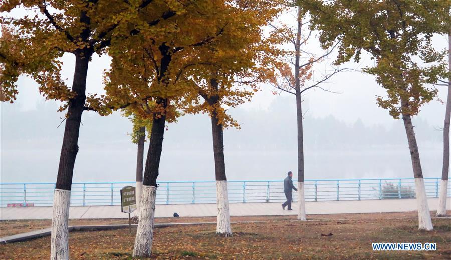 Citizens walk in a park in thick fog in Handan, north China's Hebei Province, Nov. 13, 2018. (Xinhua/Cheng Xuehu)