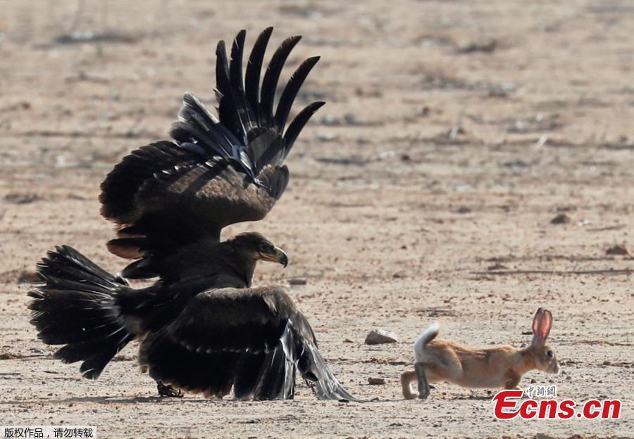 A hunting falcon catches a hare during a celebration by Egyptian clubs and austringers on World Falconry Day at Borg al-Arab desert in Alexandria, Egypt, November 17, 2018. (Photo/Agencies)