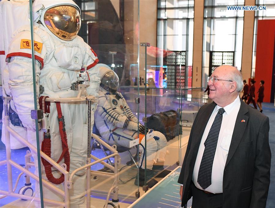 Foreign visitors view the spacesuits designed and made by China during a major exhibition to commemorate the 40th anniversary of China's reform and opening-up at the National Museum of China in Beijing, capital of China, Nov. 19, 2018. (Xinhua/Li He)