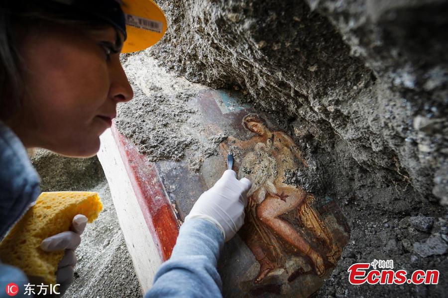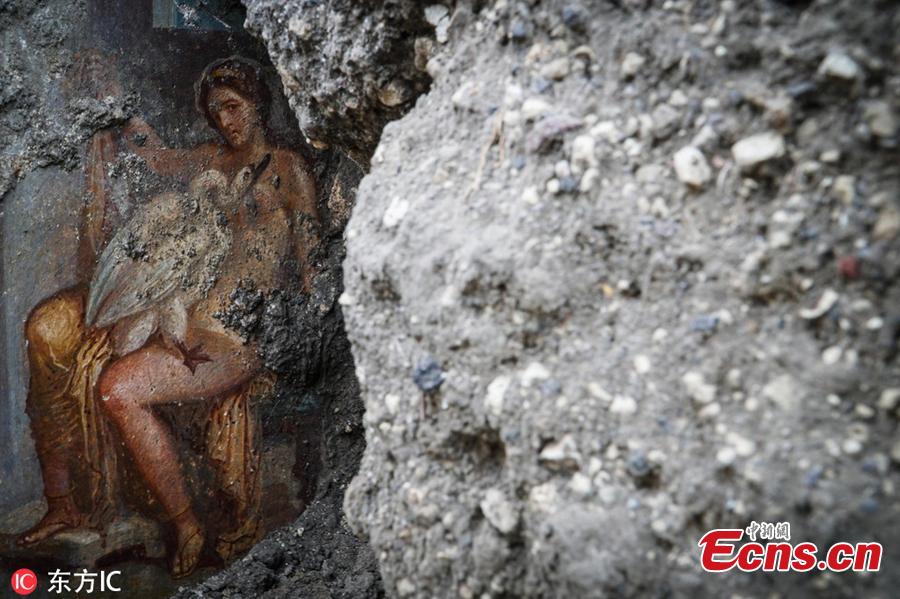 Photo taken on November 19, 2018 shows an image of the fresco "Leda e il cigno" (Leda and the swan) recently discovered in the Regio V archeological area in Pompeii, Naples district, Italy. (Photo/IC)