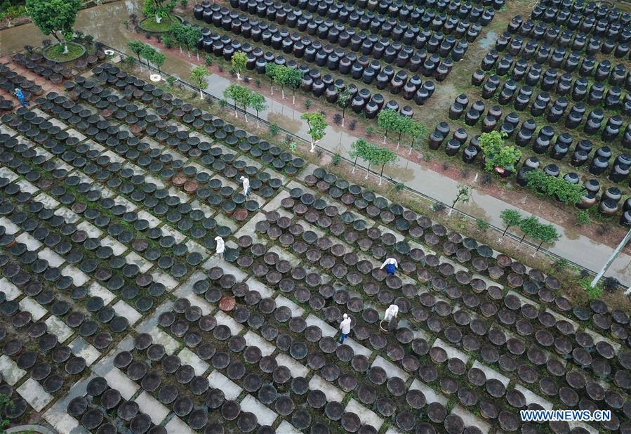 Aerial photo taken on Nov. 18, 2018 shows workers checking jars at a vinegar plant in Chishui, southwest China's Guizhou Province. Chishui maintained a traditional method to make vinegar with over 30 process steps.(Xinhua/Wang Changyu)