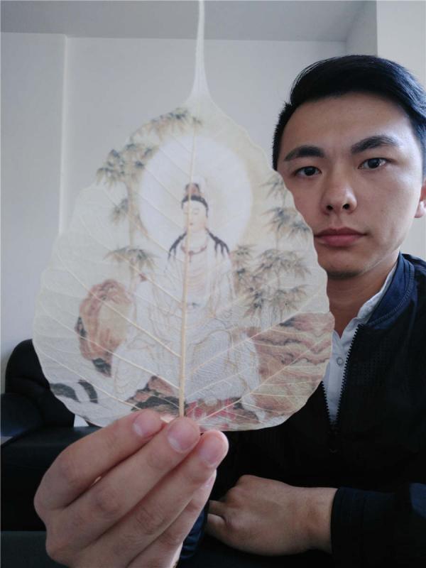Ding started to learn painting at 5, and began learning carving at 12. When he first found out about leaf painting at 13 years old, he became obsessed with the art.