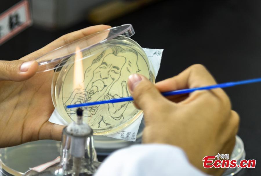 Patterns formed with bacteria are shown in petri dishes during a microbial art competition at China Pharmaceutical University in Nanjing, East China’s Jiangsu province. Students of the school have created artworks by placing various strains of bacteria like staphylococcus and colibacillus into petri dishes, and letting the microbes react and spread across carefully drawn patterns. (Photo: China News Service/ Jiang Chen)