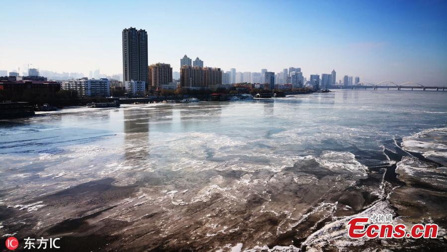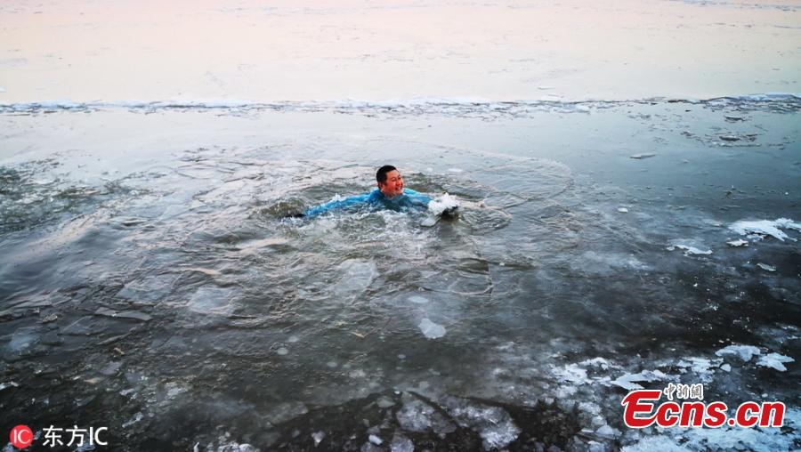 A winter swimming enthusiast broke the ice and jumped into the Songhua River to start his winter swimming season in Harbin, Northeast China's Heilongjiang province, on Nov 23, 2018. Hundreds of winter swimming enthusiasts swim in the river every year. (Photo/VCG)