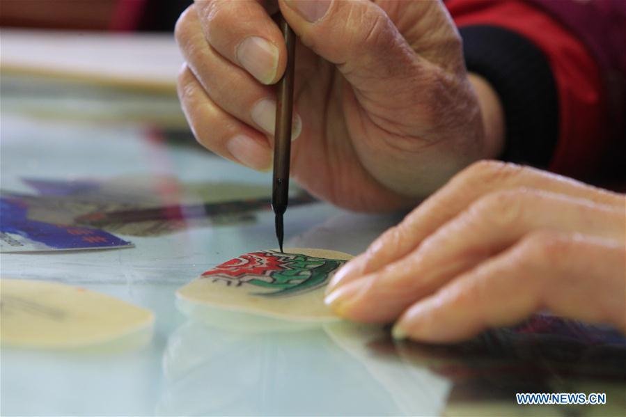 Zhang Kunrong paints on a shadow puppetry piece in Haining City, east China's Zhejiang Province, Nov. 20, 2018. Zhang Kunrong, 79, a locally born shadow puppetry player, is an inheritor of the Haining shadow puppetry, a form of traditional theatre acted by colorful silhouette figures made from leather or paper, accompanied by music and singing. A typical variety popular in south China, Haining shadow puppetry, a national intangible cultural heritage, has a history of about 900 years dating back to the Southern Song Dynasty (AD 1127-1279). Obsessed with the shadow play since childhood, Zhang Kunrong was recruited to the provincial shadow puppetry troupe in 1958 and soon became a mainstay after two year's practice and in the later years staged performances at home and abroad as Haining shadow puppetry grows popular. Nowadays, Zhang works more on script writing, directing and teaching apprentices. Haining shadow puppetry was listed as one of the state-level intangible cultural heritages in 2006 and was included in the UNESCO Intangible Cultural Heritage of Humanity list in 2011. (Xinhua/Sui Xiankai)