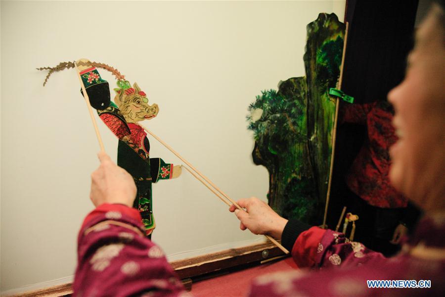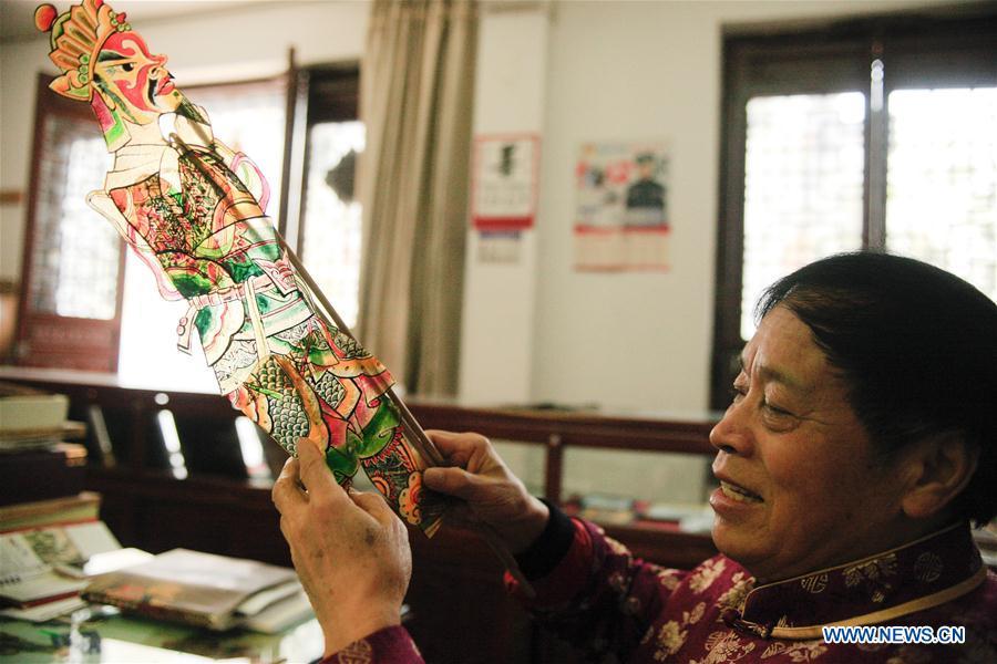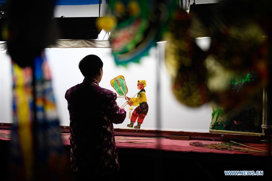 Liu Fan, one of Zhang Kunrong's apprentices, prepares before a shadow puppetry show in Haining City, east China's Zhejiang Province, Nov. 21, 2018. Zhang Kunrong, 79, a locally born shadow puppetry player, is an inheritor of the Haining shadow puppetry, a form of traditional theatre acted by colorful silhouette figures made from leather or paper, accompanied by music and singing. A typical variety popular in south China, Haining shadow puppetry, a national intangible cultural heritage, has a history of about 900 years dating back to the Southern Song Dynasty (AD 1127-1279). Obsessed with the shadow play since childhood, Zhang Kunrong was recruited to the provincial shadow puppetry troupe in 1958 and soon became a mainstay after two year's practice and in the later years staged performances at home and abroad as Haining shadow puppetry grows popular. Nowadays, Zhang works more on script writing, directing and teaching apprentices. Haining shadow puppetry was listed as one of the state-level intangible cultural heritages in 2006 and was included in the UNESCO Intangible Cultural Heritage of Humanity list in 2011. (Xinhua/Zhu Weixi)