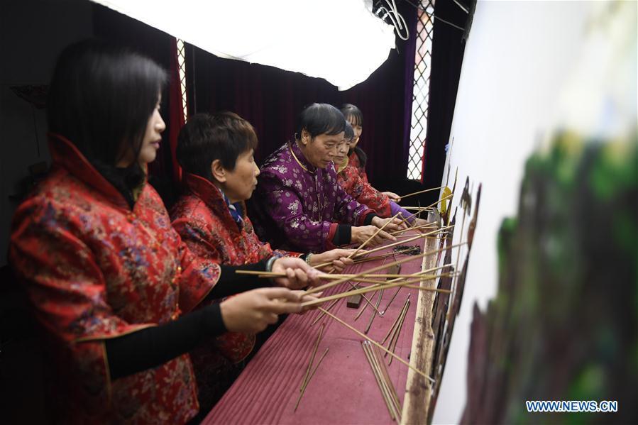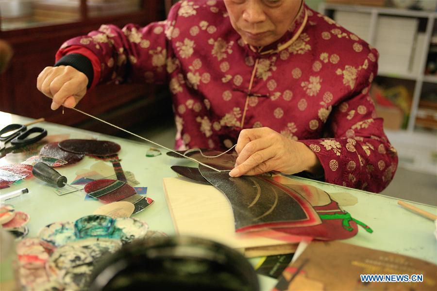 Zhang Kunrong sews parts together to make a shadow puppetry piece in Haining City, east China's Zhejiang Province, Nov. 20, 2018. Zhang Kunrong, 79, a locally born shadow puppetry player, is an inheritor of the Haining shadow puppetry, a form of traditional theatre acted by colorful silhouette figures made from leather or paper, accompanied by music and singing. A typical variety popular in south China, Haining shadow puppetry, a national intangible cultural heritage, has a history of about 900 years dating back to the Southern Song Dynasty (AD 1127-1279). Obsessed with the shadow play since childhood, Zhang Kunrong was recruited to the provincial shadow puppetry troupe in 1958 and soon became a mainstay after two year's practice and in the later years staged performances at home and abroad as Haining shadow puppetry grows popular. Nowadays, Zhang works more on script writing, directing and teaching apprentices. Haining shadow puppetry was listed as one of the state-level intangible cultural heritages in 2006 and was included in the UNESCO Intangible Cultural Heritage of Humanity list in 2011. (Xinhua/Zhu Weixi)