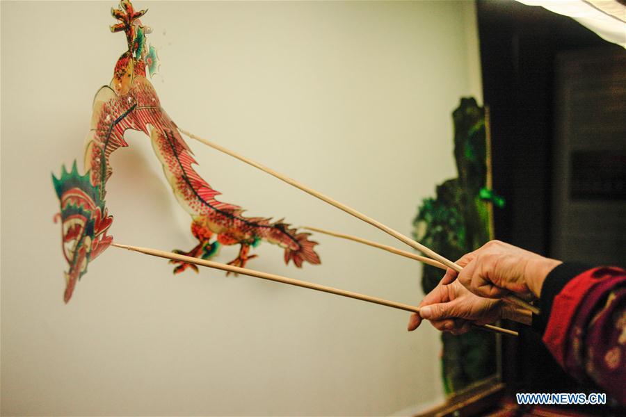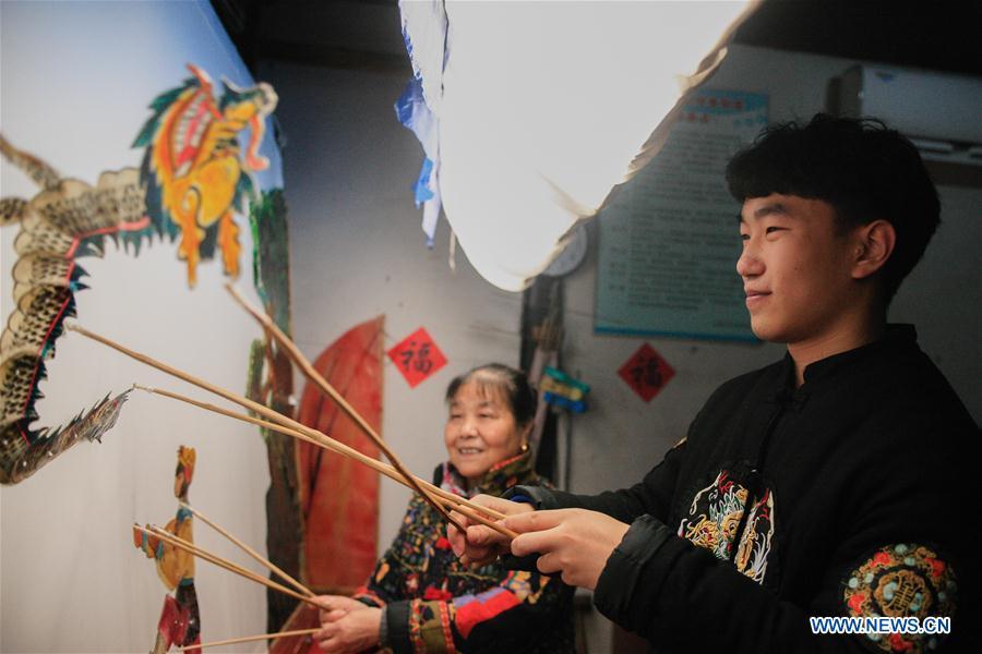 Liu Fan(R), one of Zhang Kunrong's apprentices, performs in a shadow puppetry show in Haining City, east China's Zhejiang Province, Nov. 21, 2018. Zhang Kunrong, 79, a locally born shadow puppetry player, is an inheritor of the Haining shadow puppetry, a form of traditional theatre acted by colorful silhouette figures made from leather or paper, accompanied by music and singing. A typical variety popular in south China, Haining shadow puppetry, a national intangible cultural heritage, has a history of about 900 years dating back to the Southern Song Dynasty (AD 1127-1279). Obsessed with the shadow play since childhood, Zhang Kunrong was recruited to the provincial shadow puppetry troupe in 1958 and soon became a mainstay after two year's practice and in the later years staged performances at home and abroad as Haining shadow puppetry grows popular. Nowadays, Zhang works more on script writing, directing and teaching apprentices. Haining shadow puppetry was listed as one of the state-level intangible cultural heritages in 2006 and was included in the UNESCO Intangible Cultural Heritage of Humanity list in 2011. (Xinhua/Zhu Weixi)
