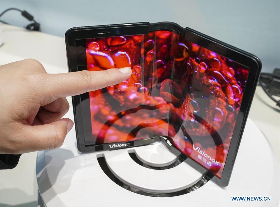 A staff member shows a phone with a foldable display screen during a major exhibition to commemorate the 40th anniversary of China's reform and opening-up at the National Museum of China in Beijing, capital of China, Nov. 24, 2018. (Xinhua/Yin Gang)