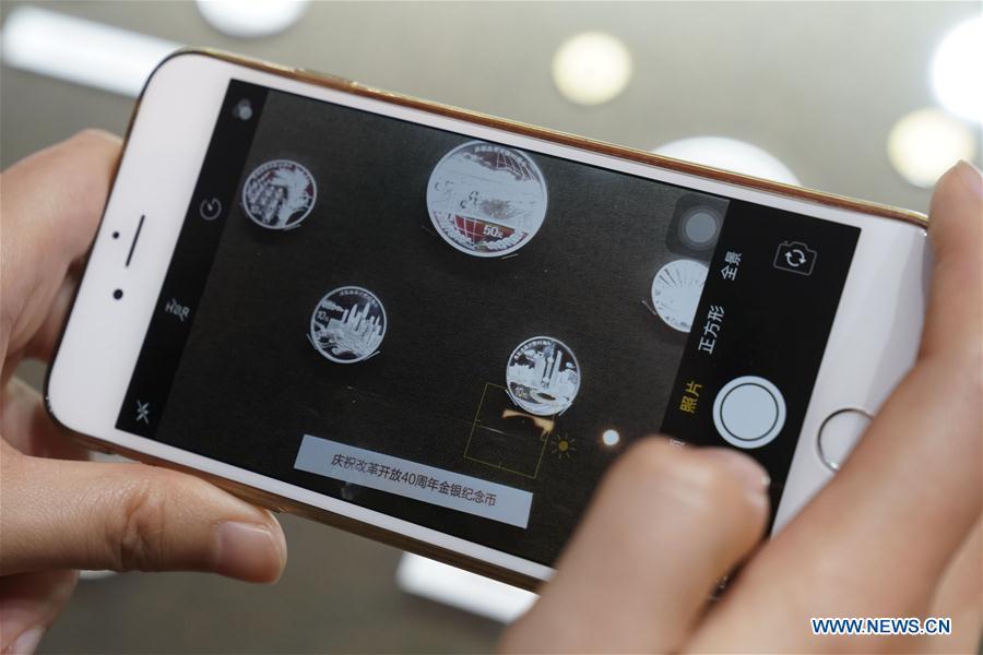 A visitor takes photos of commemorative coins displayed at a major exhibition to commemorate the 40th anniversary of China's reform and opening-up at the National Museum of China in Beijing, capital of China, Nov. 24, 2018. (Xinhua/Yin Gang)